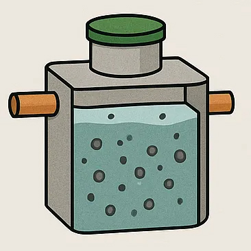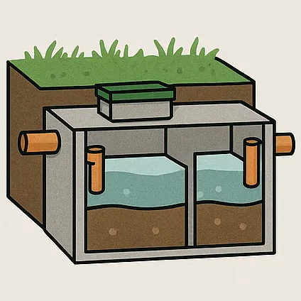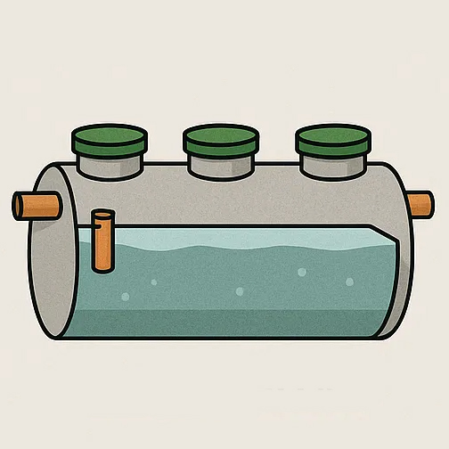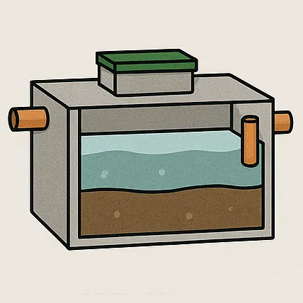 Двухкамерный септик представляет собой устройство с двумя последовательно соединёнными отсеками. В первом отсеке происходит грубая отстаивающая очистка: здесь задерживаются крупные и тяжёлые частицы, формируется осадок. Отфильтрованный таким образом сток поступает во второй отсек, где проходит дополнительное осветление и частичное разложение органики. После этого из второй камеры относительно очищенная вода может быть направлена на дальнейшую доочистку или отведена в грунт.